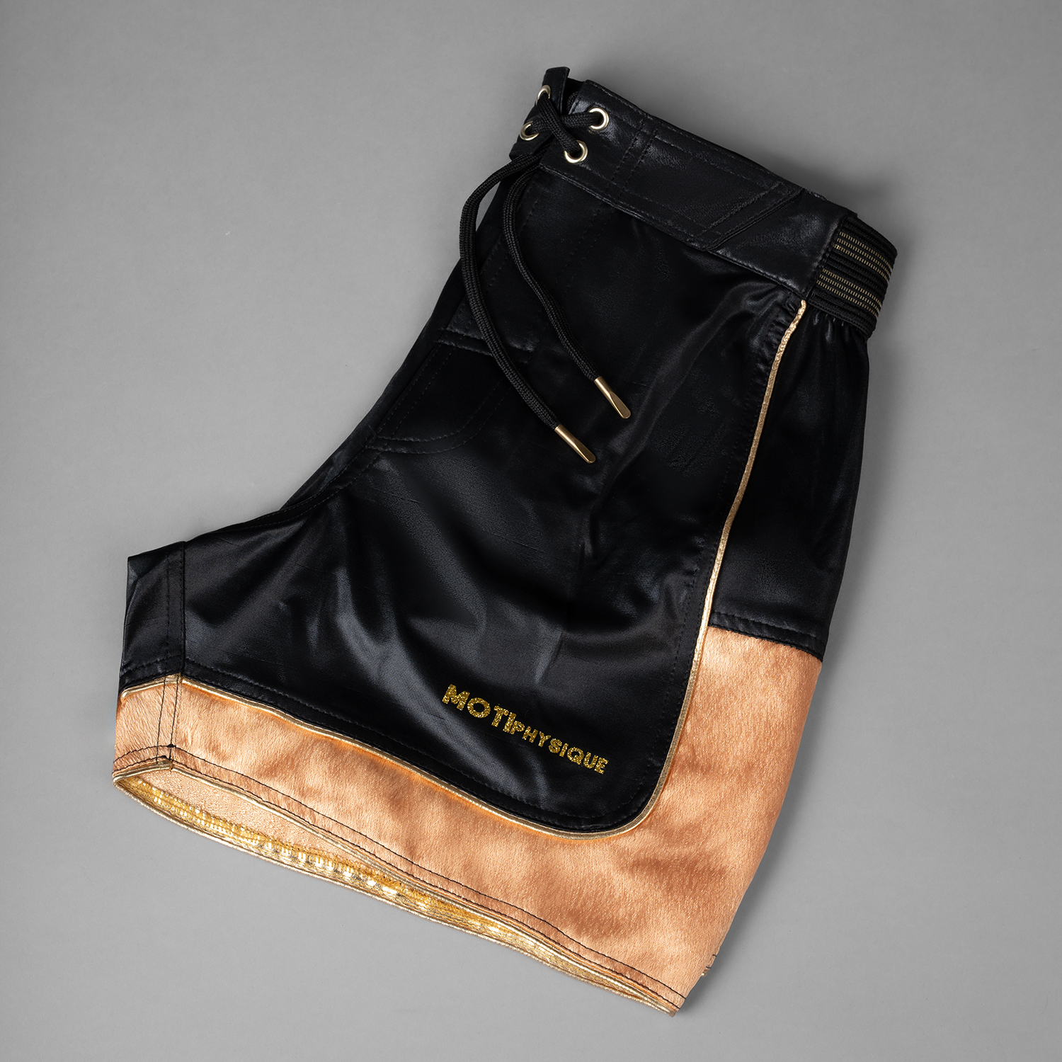شلوارک فیزیک ویژه با زمینه مشکی و جزئیات طلایی، بهویژه بخش پایینی طلایی با طرح چرم، ظاهری جسور، لوکس و کاملاً متمایز ایجاد میکند. این طراحی الهامگرفته از استایل استیج و پوشاک حرفهای فیزیک است و بیش از هر چیز برای دیدهشدن طراحی شده؛ نه برای گمشدن در جمع.