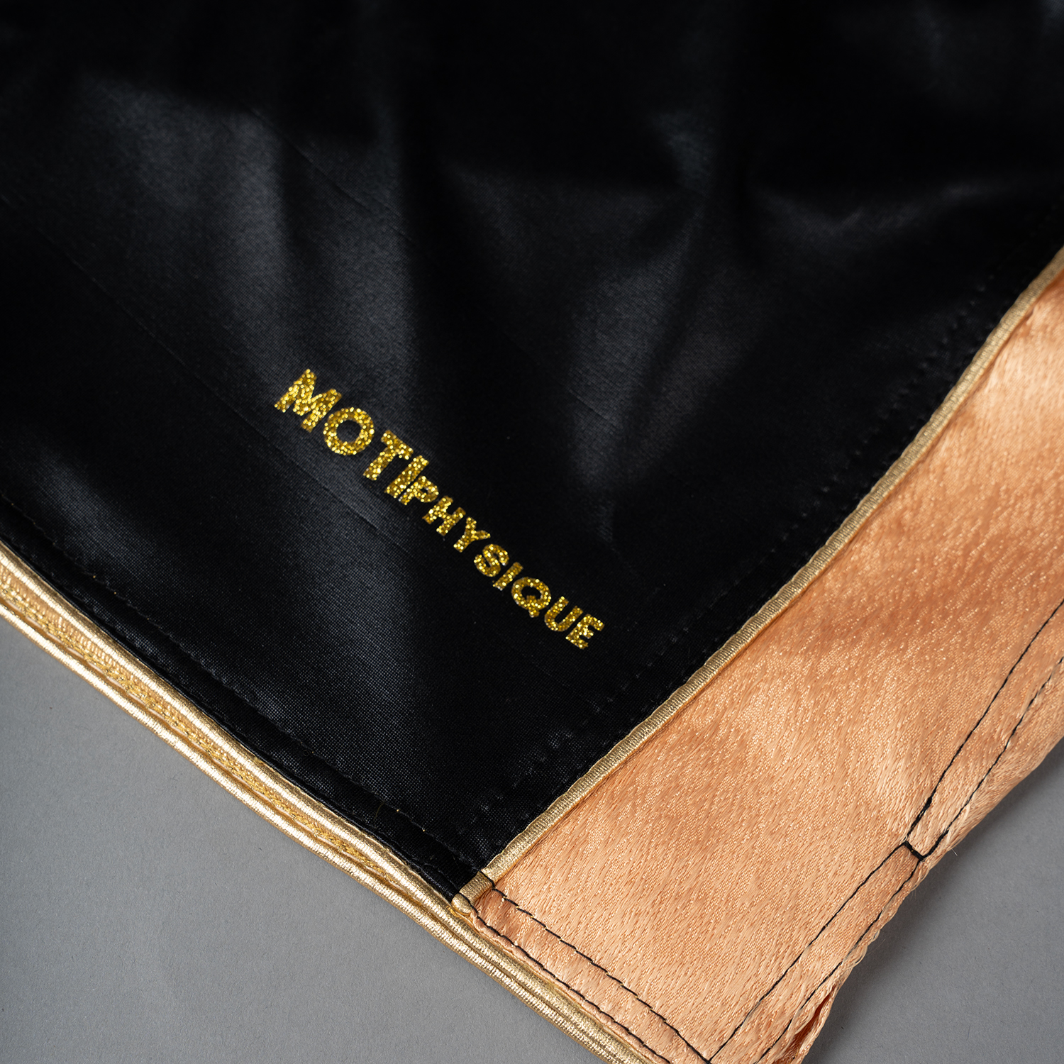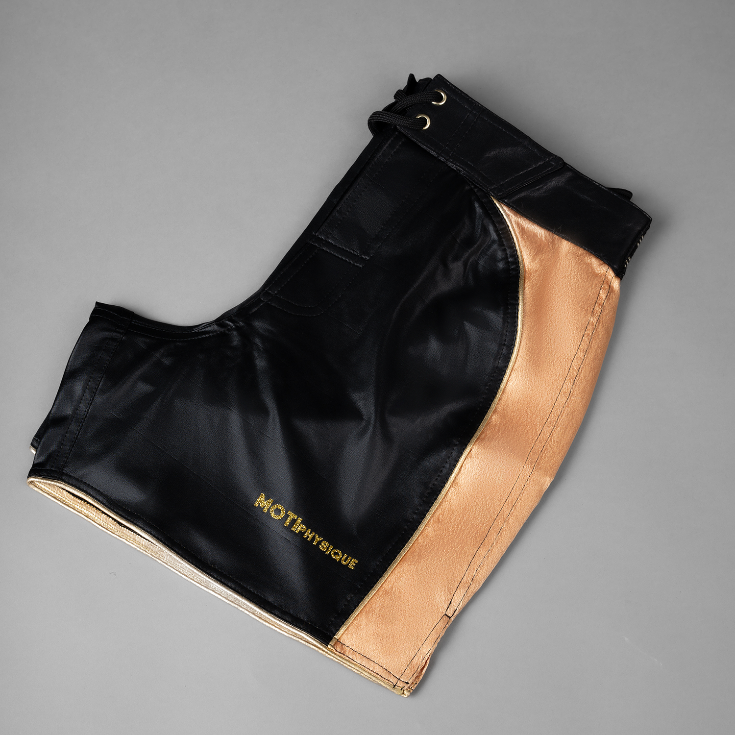 شلوارک فیزیک ویژه با زمینه مشکی و جزئیات طلایی، بهویژه بخش طلایی با طرح چرم، ظاهری جسور، لوکس و کاملاً متمایز ایجاد میکند. این طراحی الهامگرفته از استایل استیج و پوشاک حرفهای فیزیک است و بیش از هر چیز برای دیدهشدن طراحی شده؛ نه برای گمشدن در جمع.