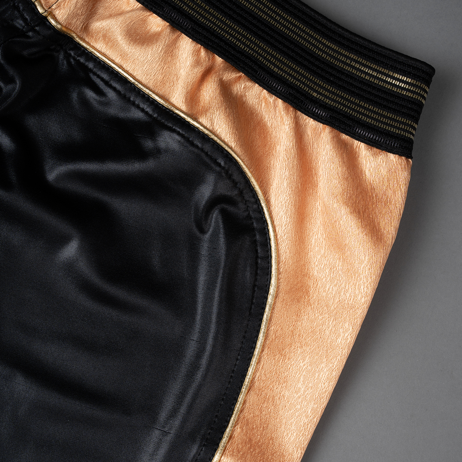 طرح چرم در قسمت پایین شلوارک، حس قدرت و استحکام را به محصول اضافه میکند و در کنار رنگ طلایی، جلوهای خاص و پرستیژدار به پاها میدهد؛ جزئیاتی که در نور تمرین یا استیج، بهوضوح خودنمایی میکند.
