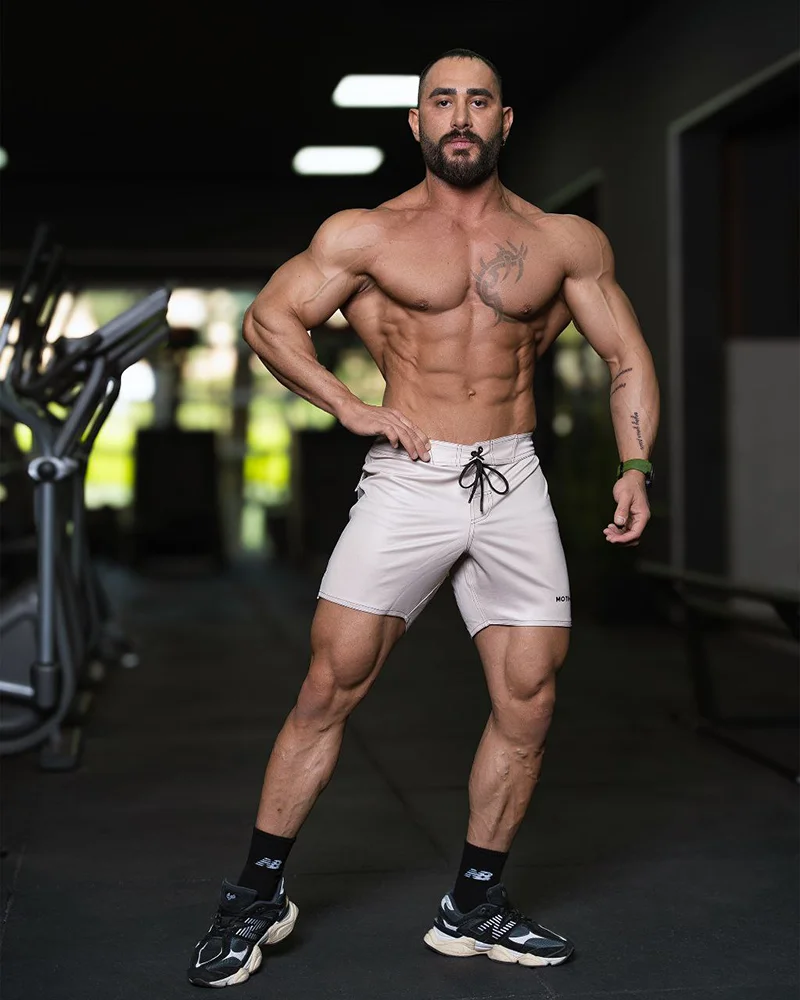 شلوارک ورزشی مردانه مدل فیزیک NPC تک رنگ موتی کرم
