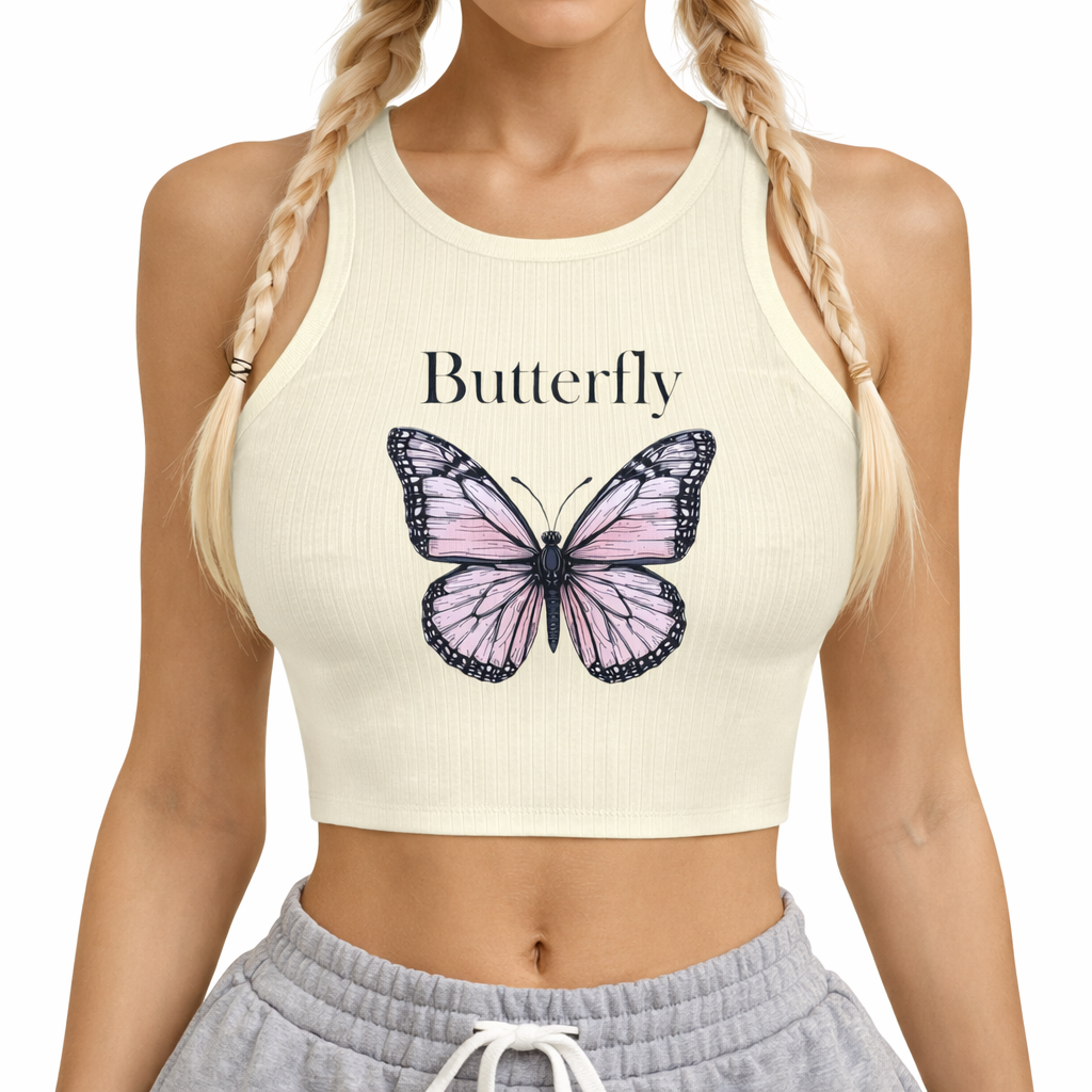 کراپ تاپ زنانه اسپرت طرح پروانه صورتی لیمویی مدل خشتی | شاد و خاص
